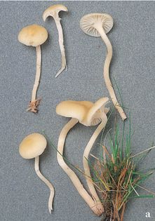 Cedarwood Waxcap Hygrocybe russocoriacea (Berk. & T.K. Mill.) P.D. Orton & Watling syn. Cuphophyllus russo-coriaceus (Berk. & Mill.) Bon (illustrated 70% life size) Cap 0.8–2cm across, convex; white to yellow-ivory, faintly striate. Stem 20–35×2–3mm, slightly wavy and tapering towards the base; whitish. Flesh whitish or tinged ivory-yellow; thick at centre of cap; smell strong, of pencil sharpenings or sandalwood. Gills decurrent, widely spaced; white. Spores 7.5–9×4–5¼, ellipsoid. Spore print white. Habitat in short grass on lawns or heaths; autumn. Frequent. Not edible.