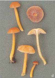 Heath Waxcap Hygrocybe laeta (Pers.) P. Kumm. syn. Hygrophorus laetus (Pers.) Fr. (illustrated 60% life size) Cap 1–3cm across, convex; flesh-coloured to pale tawny-brown, faintly striate at the margin; slimy, sticky. Stem 30–70×2–4mm; pale yellow, tinged with cap colour; very slimy, soon becoming hollow. Flesh tawny in cap, more yellowish in stem; thin; taste and smell not distinctive. Gills decurrent, widely spaced but connected by veins; whitish to flesh-coloured. Spores 5–7.5×4–5¼, broadly ellipsoid. Spore print white. Habitat on heaths, usually amongst bracken; late autumn. Common. Edible good.