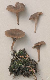 Arrhenia griseopallida (Desm.) Watling syn. Omphalina griseopallida (Desm.) Quél. (illustrated life size) Cap 1–1.5cm across, convex with depressed centre; dark grey-brown, drying pallid. Stem 10–12×2–3mm; concolorous; base covered in fine, white down. Flesh thin; concolorous. Gills decurrent; concolorous with cap. Spores 9–12×5–6¼, broadly elliptical. Spore print white. Habitat amongst grass on open heathland; autumn. Uncommon. Not edible.