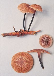 Foetid Parachute Micromphale foetidum (Sowerby) Singer syn. Marasmius foetidus (Sowerby) Antonin, Halling & Noordel (illustrated 70% life size) Cap 1–3cm across, convex then expanded and slightly depressed at the centre; dingy reddish-buff, darker at the centre; thin, membranous, pliant, and with persistent radiating furrows. Stem 10–25×1–2mm, tapering towards the base; dark brown to black; tough, velvety. Flesh concolorous; very thin; smell fetid. Gills distant, connected by veins; clay-pink. Spores 8–10×3–4¼, pip-shaped. Spore print white. Habitat in troops on fallen twigs of deciduous trees, especially hazel and beech; late summer to early winter. Occasional. Not edible.