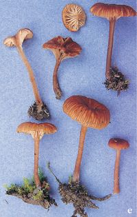 Omphalina pyxidata (Bull. ex Pers.) Quél (illustrated 70% life size) Cap 0.5–2cm across, convex, deeply umbilicate; reddish-brown or pinkish-brown to yellowish; smooth, deeply radially fluted. Stem 10–30×1–3mm; paler than cap; smooth. Flesh pallid, brownish. Gills decurrent, widely spaced; brownish. Spores 7–10×4.5–6¼, almond-shaped. Spore print white. Habitat in grass on sandy soils; summer to autumn. Occasional. Unknown edibility.