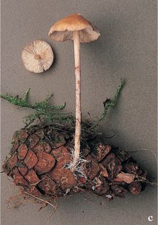 Conifercone Cap Baeospora myosura (Fr.) Singer syn. Collybia myosura (Fr.) Quél. (illustrated 65% life size) Cap 1–3cm across, convex to almost flat; pallid-tan to date-brown. Stem 30–50×1–2mm, elongated into a hairy base; pallid, flushed with cap colour. Flesh brownish; thin; taste mild, smell mushroomy. Gills very crowded; whitish. Spores 3–3.5×1.5–2¼, elliptical; amyloid. Spore print white. Cheilocystidia fusoid, thin-walled. Habitat rooting on partly buried pine cones and coniferous debris; autumn to late winter. Frequent. Not edible.