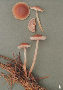 Mycena pearsoniana Dennis ex Singer syn. M. pseudopura sensu Pearson (illustrated 50% life size) Cap 1–2cm across, convex, flattening and turning up at margin; pale buff with violet tint, paler and striate at margin. Stem 30–50×2–3mm; pale flesh-coloured. Flesh brownish; thin at margin; taste mild or slightly rancid, smell radishy. Gills horizontal, adnate with decurrent tooth; whitish, flushed violet. Spores 5–7×3.5–4.5¼, pip-shaped; nonamyloid. Spore print white. Cheilocystidia numerous, cylindrical with rounded apex, thin-walled. Habitat on spruce debris; summer to autumn. Uncommon. Not edible.
