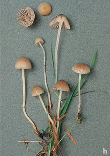 Yellowleg Bonnet Mycena epipterygia (Scop.) Gray (illustrated 55% life size) Cap 1–2cm across, convex, expanding to bell-shaped, the margin often delicately toothed; fawn, especially at the centre, with yellowish tinge, having a striate appearance when moist; cuticle viscid, easily removed. Stem 40–70×1–2mm; pale yellow; viscid. Flesh very thin; taste mild, smell slight, not distinctive. Gills subdecurrent; pale pink; the edge is glutinous and can be removed with a needle when fresh. Spores 8–10×4.5–5¼, ellipsoid; amyloid. Spore print white to pale buff. Cheilocystidia clavate, covered with irregular, knobbly, sometimes branched processes. Habitat in grass or amongst moss in woodland or on heaths; autumn. Common. Edible but not worthwhile.