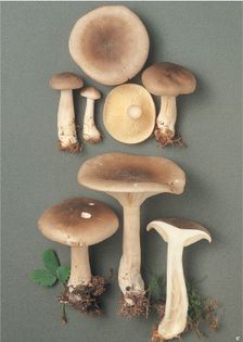 Clouded Funnel or Clouded Agaric Clitocybe nebularis (Batsch.) P. Kumm (illustrated 30% life size) Cap 5–20cm across, convex at first, becoming flattened or occasionally slightly depressed in the centre, the margin remaining inrolled; cloudy grey, sometimes tinged with buff, darker at the centre; often covered with a white bloom. Stem 50–100×15–25mm, swollen towards the base; paler than the cap; becoming hollow, fibrous and easily broken. Flesh white; thick; smell strong and sweetish. Gills decurrent, crowded; whitish, later with a yellow flush. Spores 5.5–8×3.5–5¼, ovoid-elliptical. Spore print cream. Habitat in deciduous or coniferous woods, often in rings or troops; late summer to late autumn.Very common. Said to be edible but known to cause gastric upsets in many people. Note the European C. nebularis var. alba Bataille differs only in the milk-white cap; it can be distinguished from other white, fleshy Clitocybes by its relatively large spores. Very rare in Britain.