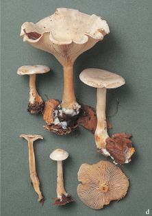 Frosty Funnel Clitocybe phyllophila (Pers.) P. Kumm (illustrated 50% life size) Cap 3–10cm across, convex at first, later irregularly funnel-shaped with a wavy margin; covered in a dull white bloom first, later flushed pale ochraceous or flesh-colour. Stem 40–65×8–15mm, swollen at the base; concolorous with cap or light tan; base covered in white down. Flesh whitish to tan; smell sweetish. Gills decurrent, crowded; whitish to flesh-coloured. Spores 4–4.5×3–3.5¼, broadly ovate. Spore print pale ochraceous-clay. Habitat amongst leaf litter in deciduous and coniferous woods; autumn. Common. Unknown edibility.