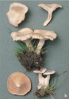 Ivory Funnel Clitocybe dealbata (Sowerby) P. Kumm. (illustrated 50% life size) Cap 2–4cm across, flattened-convex, becoming slightly depressed; buff, dusted white. Stem 20–35×5–10mm; whitish; mealy at the apex. Flesh whitish; thin except for the centre of the cap; smell faint, mealy. Gills adnate to decurrent, crowded; whitish or cream. Spores 4–5.5×2–3¼, broadly ovate. Spore print white. Habitat in lawns and pastures, often in troops or rings; summer to late autumn. Frequent. Deadly poisonous. Note the name is actually nomen dubium, but has been so widely used that most authors continue to use it. Similar to C. rivulosa (below).