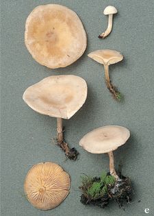Fool’s Funnel Clitocybe rivulosa (Pers.) P. Kumm. (illustrated 50% life size) Cap 2–5cm across, convex at first, then flattened and depressed in the centre, the margin remaining slightly inrolled; powdered white, often with concentric rings or markings where the flesh-coloured basic tint shows through. Stem 20–40×4–10mm; concolorous with cap; slightly woolly at the base. Flesh white to buff; smell sweet. Gills decurrent, crowded; whitish to buff. Spores 4–5.5×2.5–3.5¼, ovoid-ellipsoid. Spore print white. Habitat in troops or rings in grass on sandy soil, often along path edges or roadsides; late summer to late autumn. Common. Deadly poisonous. Note this is very close to and sometimes synonymized with C. dealbata (above).