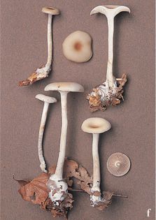 Clitocybe metachroa (Fr.) P. Kumm. syn. C. dicolor (Pers.) Murrill (illustrated 40% life size) Cap 3–5cm across, flattened-convex at first, soon deeply depressed; white when dry, pale tan-buff when moist with darker centre. Stem 30–60×4–8mm; concolorous with cap, darkening below; becoming hollow, tough, with silky, white fibres along its length. Flesh tan-buff; thin; smell none or faint, not mealy. Gills slightly decurrent, crowded; white to greyish. Spores 6–7×3.5–4¼, ovate. Spore print white. Habitat in coniferous and deciduous woods; autumn. Common. Unknown edibility.