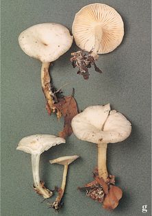 Clitocybe houghtonii (W. Phillips) Dennis syn. Omphalia roseotincta A. Pearson (illustrated 35% life size) Cap 2–8cm across, initially convex, becoming flattened and often deeply depressed at the centre; pale pinkish-buff when fresh, drying almost white. Stem 30–80×3–8mm, often developing a ring-like swelling at the apex as the fungus dries; concolorous with cap. Flesh white; thin; smell sweetish, reminiscent of crushed tomato leaves. Gills crowded, decurrent; pinkish-cream. Spores 5–6.5×3–4¼, elliptical; nonamyloid. Spore print white. Habitat gregarious in beech litter; late summer to late autumn. Uncommon. Unknown edibility, best avoided.