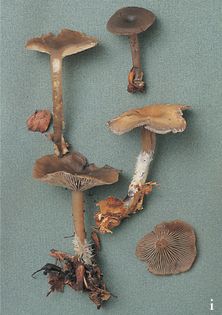Mealy Frosted Funnel Clitocybe ditopa (Fr.) Gillet (illustrated 50% life size) Cap 2–4cm across, flattened-convex with depressed centre, soon becoming funnel-shaped; dark grey-brown, drying paler, with a pale, almost white margin. Stem 25–40×4–8mm; grey-brown; becoming hollow, covered in long, white, cottony fibres towards the base. Flesh brown; thin; smell mealy. Gills adnate to slightly decurrent, rather crowded; dark grey. Spores subglobose, 3–3.5×2.5–3¼. Spore print white. Habitat in conifer woods; autumn. Occasional. Toxicity unknown.