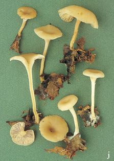 Chicken Run Funnel Clitocybe phaeophthalma (Pers.) Kuyper syn. C. hydrogramma sensu auct. mult. (illustrated 40% life size) Cap 2–5cm across, convex to depressed at first, becoming funnel-shaped; hygrophanous, drying almost white. Stem 50–80×3–6mm; concolorous with cap or paler; cartilaginous, hollow, base downy. Flesh whitish; smell strong, unpleasant. Gills deeply decurrent, rather widely spaced; pallid. Spores 5–6.5×3–3.5¼, elliptical. Spore print white. Surface of cap showing conspicuous, inflated hyphal segments up to 20¼ wide, varying in shape from globose to fusoid. Habitat deciduous woods; autumn. Occasional. Unknown edibility, best avoided.