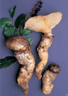Catathelasma imperiale (Fr.) Singer (illustrated 25% life size) Cap 12–40cm across, convex, becoming flat, margin incurved at first; blackish to dingy brown; slightly sticky, later dry, breaking up into patches. Stem 120–180×50–80mm, tapering to a rooting base; dry, covered by a pinky-brown, membranous sheath. Flesh white; hard, thick; taste and smell mealy. Gills decurrent, close, narrow becoming broad; yellowish to pale greenish-grey. Spores 11–14×4–5.5¼, cylindrical, smooth; amyloid. Spore print white. Habitat in conifer woods and parks; late summer to autumn. Rare in mainland Europe, not recorded for Britain. Edible.