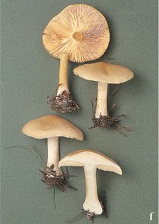 Melanoleuca strictipes (P. Karst.) Jul. Schäff. (illustrated 30% life size) Cap 4–10cm across, convex and slightly umbonate; white to cream or pallid, sometimes darker at the centre. Stem 80–140×8–12mm, often twisted, swollen at the base or bulbous; concolorous with cap or paler; fibrous. Flesh white; thick; taste slight, smell strongly of meal. Gills white to cream, sometimes tinged slightly pinkish. Spores 8–9×4.5–5¼, elliptical, minutely warted; amyloid. Spore print white. Cheilocystidia lanceolate, often encrusted with crystals at apex, thin-walled, hyaline. Habitat amongst grass in open woodland or pasture; early summer to autumn. Rare. Edible but too rare to pick. Note Henrici (2001) comments that the cap and gills here are rather strongly coloured for this species.