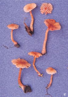 Laccaria striatula (Peck) Peck (illustrated 50% life size) Cap 1–4cm across, convex, soon becoming flattened; flesh-pink to pinkish-brown, striate; dry. Stem 20–50×2–4mm; pinkish-brown; fibrillose. Flesh brownish; smell not distinctive. Gills adnate, thick, widely spaced; pinkish. Spores 9–12.5×9–12.5¼, globose. Spore print white. Habitat on river banks and in damp places; summer to autumn. Rare. Unknown edibility.