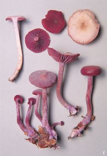 Amethyst deceiver Laccaria amethystina (Huds.) Cooke. syn. L. laccata var. amethystea sensu auct. (illustrated 50% life size) Cap 1–6cm across, convex to flattened or centrally depressed; deep purplish-lilac when moist, drying pale lilac-buff; slightly scurfy at centre, especially with age. Stem 40–100×5–10mm; concolorous with cap; becoming hollow, covered in whitish fibres below but mealy near the apex, base covered in lilac down, passing into the lilac mycelium. Flesh tinged lilac; thin; taste and smell not distinctive. Gills often distant; concolorous with cap, becoming powdered white. Spores 9–11¼ in diameter, globose, spiny. Spore print white. Habitat in coniferous or deciduous woods, often with beech; late summer to early winter. Very common. Edible and worth collecting if found in abundance. Note the now accepted spelling.