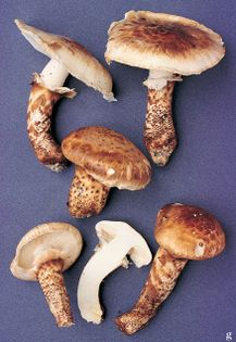 European Matsutake Tricholoma caligatum (Viv.) Ricken syn. Armillaria caligata (Viv.) Gillet (illustrated 40% life size) Cap 5–12cm across, broadly convex, with the margin sometimes uplifted in age and hung with veil remnants; creamy flesh showing beneath cinnamon-brown patches or scales; dry. Stem 50–100×20–30mm; white above the ring, cinnamon-brown zones and patches of veil remnants below. Flesh white; taste mild or slightly bitter, smell fragrant, occasionally foul. Gills adnate, close, narrow to moderately broad; white, staining brownish with age. Spores 6–7.5×4.5–5.5¼, broadly ellipsoid, smooth; nonamyloid. Spore print white. Habitat in coniferous woods, normally in mountains; midsummer to autumn. Very rare, endangered on Red Data List, more common in southern Europe. Edible and much sought after in Japan.