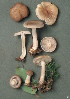 Girdled Knight Tricholoma cingulatum (Almfelt) Jacobashch (illustrated 45% life size) Cap 3.5–6cm across, expanded convex with a slight umbo; pale grey; covered in fine, grey-brown felt. Stem 50–80×8–12mm; whitish; somewhat woolly ring. Flesh white; taste and smell mealy. Gills emarginate; whitish. Spores 4–5.5×2.5–3.5¼. Spore print white. Habitat usually with willows; late summer to late autumn. Occasional. Edible.