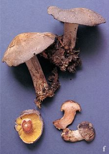 Gilded Domecap Lyophyllum favrei (R. Haller. Aar. & R. Haller Suhr) R. Haller. Aar. & R. Haller Suhr syn. Tricholoma favrei R. Haller. Aar. & R. Haller Suhr syn. Calocybe favrei (R. Haller. Aar. & R. Haller Suhr) Bon (illustrated 40% life size) Cap 5–8cm across, convex, umbonate; slate-blue to blue-lilac. Stem 45–70×10–18mm; similar to cap colour but lighter. Flesh turning pinkish; taste strong, mealy, smell mealy. Gills free; bright golden-yellow. Spores 3.5–5×3–3.5¼, subspherical. Spore print white. Habitat in mixed woods; late summer to early winter. Very rare, endangered on Red Data List. Not recommended far too rare to collect.