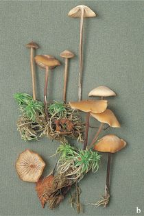 Sphagnum Greyling Tephrocybe palustris (Peck) Donk syn. Collybia palustris (Peck) A.H. Sm. (illustrated 75% life size) Cap 1–2cm across, bell-shaped, flattening when expanded; greyish-brown, striate almost to the paler centre, pallid when dry. Stem 20–30×2–3mm; pallid. Flesh pale buff; smell mealy. Gills adnate or with a small decurrent tooth; pale buff. Spores 5.5–8.5×4–5¼, ovoid. Spore print white. Habitat often in troops, in sphagnum; late spring to autumn. Occasional. Unknown edibility.