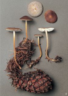 Pinecone Cap Strobilurus tenacellus (Pers.) Singer syn. Pseudohiatula tenacella (Pers.) Métrod (illustrated 90% life size) Cap 1–2.5cm across, convex, becoming flattened and umbonate; brown, often paler at centre. Stem 40–80×1–3mm, base very long and rooting; white at apex, ochre-brown below; tough. Flesh concolorous; thin; taste bitter, smell not distinctive. Gills white. Spores 6–7.5×2.5–3.5¼. Spore print white. Cheilo- and pleurocystidia fusoid, thin-walled, hyaline. Cap cuticle of globose cells with a stalked base. Habitat attached to buried pine cones by the long rooting system; spring. Occasional. Not edible too small.