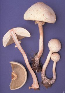 Green-gilled Lepiota Chlorophyllum molybdites (G. May.) Massee (illustrated 35% life size) Cap 5–30cm across, hemispherical to broadly convex, becoming flatter; whitish underneath, covered with thin layers of pale pinkish-buff volval tissue, breaking up into many small scales and patches as the cap expands; dry, smooth or minutely hairy below, with scales curling up with age. Stem 50–250×8–25mm, sometimes enlarging towards the base; whitish, slowly becoming dingy grey; smooth. Flesh white, discolouring dingy red when bruised; thick; smell faint or slightly pungent. Gills free, close, broad; whitish, slowly becoming dirty grey-green or darker. Spores 8–13×6.5–8¼, ovoid or ellipsoid, with a small germ pore at the tip, smooth, thick-walled. Spore print greenish. Pleurocystidia absent. Habitat occasionally found in heated greenhouses. Poisonous can be confused with edible Macrolepiota species. Note this is a mushroom of tropical and warm areas, including the southern United States. I have included it because it is a poisonous species often eaten in error by Europeans when travelling. The main characteristic distinguishing it from the Macrolepiotas is the green tinge developed by the white gills as they age.