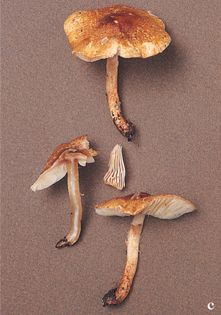 Girdled Dapperling Lepiota boudieri Bres. (illustrated 55% life size) Cap 2–5cm across, umbonate; deep ochre to orange-brown with darker brown centre; almost smooth at first, then covered in adpressed fibrils, which do not disrupt into distinct scales. Stem 30–60×3–6mm; whitish at the apex; covered in brownish, cottony velar remains below the ring zone. Flesh white in cap, brownish in stem; smell strong and fungusy. Gills free; whitish, sometimes with a yellow tinge. Spores 8–9×3.5–4.5¼, bullet-shaped; dextrinoid. Spore print white. Cap surface formed of elongated, obtuse, thin-walled, brown hairs; when mounted in water these can be seen to contain pigment granules in the ‘sap’, but these dissolve instantly in the presence of alkali. Habitat in damp woods, especially under hazel; autumn. Occasional. Unknown edibility.