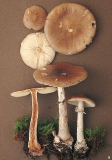 Grey Veiled Amanita Amanita porphyria Alb. & Schwein. (illustrated 45% life size) Cap 5–9cm across, convex becoming flattened; pale greyish-brown with vinaceous flush; smooth. Stem 100–130×10–15mm; whitish; ring thin and fragile, basal bulb encased in a short volva. Flesh whitish, becoming brown; taste unpleasant, smell slight. Gills free to adnexed; white. Spores 7.5–9.5¼ diameter, globose; amyloid. Spore print white. Habitat in coniferous or mixed woods; late summer to autumn. Occasional. Not edible.