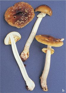 Amanita franchetii (Boud.) Fayod syn. A. aspera sensu auct. mult. (illustrated 30% life size) Cap 7–9cm across; pale or dingy brown; the surface densely covered with the remains of the universal veil, showing as pointed, sulphur-yellow warts. Stem 80–100×20–30mm; pale buff; large, membranous ring often embellished with light sulphur veil remnants, as is the bulbous stem base with the remains of the volva. Flesh white, discolouring brown where eaten by insects and such; smell faint, not distinctive. Gills adnate or with a slight decurrent tooth; white. Spores 9×6–6.5¼, broadly ovate; amyloid. Spore print white. Habitat in deciduous woods; autumn. Rare. Said to be edible but not worthwhile.