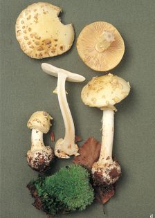 False Deathcap Amanita citrina Pers. (illustrated 50% life size) Cap 4–10cm across; ivory to pale lemon especially near the centre; covered in persistent, coarse, whitish patches, which discolour ochre-brown. Stem 60–80×8–12mm, tapering and longitudinally lined above the membranous ring, with large basal bulb; ivory white; becoming hollow in older specimens; remains of the volva encase basal bulb and create a trough around the stem. Flesh white; taste unpleasant, smell strong, of raw potatoes. Gills adnexed; whitish. Spores 9.5×7.5¼, almost spherical; amyloid. Spore print white. Habitat in deciduous or coniferous woods, especially with beech; summer to late autumn. Very common. Not edible of no interest, as the strong taste and smell make it unpleasant, and to be avoided due to possible confusion with the deadly A. phalloides. A move to using ever-earlier recorded names for fungi possibly means that A. citrina needs to be called A. bulbosa var. citrina, but it is to be hoped that a name in such common usage may be left unchanged.