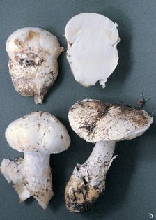 Bearded Amanita Amanita ovoidea (Bull.) Quél. (illustrated 25% life size) Cap 8–25cm across, remaining at the button stage for a long time and hemispherical at first. Stem 100–150×50mm, ending in a bulbous rooting base; scaly with delicate, mealy, white scales; volva is sack-like, creamy white to ochraceous in age; ring is white and of a delicate, mealy texture, soon breaking up. Flesh white; taste and smell slight. Gills free, crowded; white. Spores 10–12×6.5–7.5¼, broadly elliptical; amyloid. Spore print white. Habitat in or near mixed woodland, on calcareous soils; summer to autumn. Very rare in Britain, on Red Data List, more common for mainland Europe. Said to be edible but easily confused with other deadly species, so I strongly advise it should never be eaten.