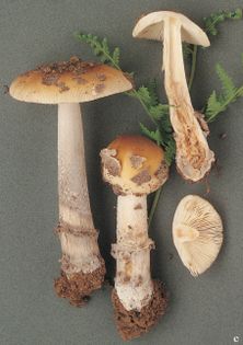 Snakeskin Grisette Amanita ceciliae (Berk. & Broome) Bas syn. A. inaurata Secr. ex Gillet syn. A. strangulata sensu auct. mult. (illustrated 45% life size) Cap 7–12cm across, convex at first then expanding to broadly bell-shaped, margin distinctly grooved; greyish-brown, covered in large, dingy grey, warty patches of volva. Stem 75–130×15–20mm; pale grey-brown, with distinctive white, shaggy, horizontal bands of veil remnants; bulb encased in an easily broken volva, soon falling away to show oblique ridges; ring absent. Flesh white; smell faint or none. Gills white. Spores 10.5–13¼ in diameter, globose; nonamyloid. Spore print white. Habitat in mixed woodland; autumn. Occasional. Unknown edibility and best avoided as it is very possibly poisonous.