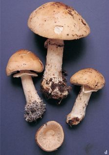 Limacella guttata (Pers.) Konrad & Maubl. syn. L. lenticularis (Lasch.) Maire. (illustrated 40% life size) Cap 6–15cm across, obtusely convex, becoming broader with an umbo, margin incurved and cottony at first, then often splitting radially; background whitish, cuticle dull ochre to pale tan or creamy, then somewhat cracked. Stem 100–150×10–25mm, solid, base enlarged into an oval bulb; creamy, with olive-grey stains in age; longitudinally lined with adpressed hairs above and below the ring; partial veil leaves a thin, floppy, membranous ring, pale pinkish-gray and minutely hairy on both sides. Flesh white; thick; taste mild or slightly mushroomy, smell slightly mealy when wet. Gills free, close, broad; pure white at first, becoming olive-grey in age. Spores 4–5×3.5–4¼, ellipsoid to subglobose, smooth; nonamyloid. Spore print white. Habitat scattered or in groups with elm or ash, in damp areas; autumn. Uncommon. Unknown edibility.