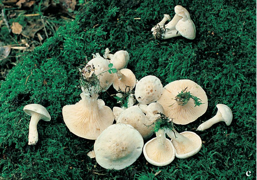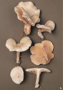 The Miller Clitopilus prunulus (Scop.) P. Kumm. (illustrated 50% life size) Cap 3–10cm across, convex then irregularly depressed, lobed and wavy; white to pale cream or greyish; textured like kid leather. Stem 15–25×4–12mm, often off-centre; concolorous with cap. Flesh white, firm; taste and smell strongly mealy. Gills decurrent; white then pink. Spores 8–14×5–6¼, ellipsoid, longitudinally ridged. Spore print pink. Habitat in grass in open woodland; summer to late autumn. Common. Edible good.