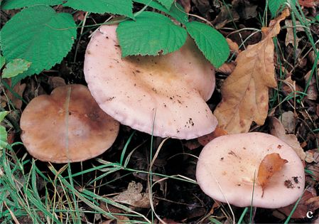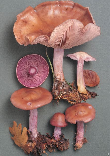 Wood Blewit Lepista nuda (Bull.) Cooke (illustrated (d) life size) Cap 6–12cm across, flattened-convex, becoming depressed and wavy; bluish-lilac at first then more brownish, drying paler. Stem 50–90×15–25mm, often slightly bulbous at the base; bluish-lilac; fibrillose. Flesh thick; bluish-lilac; taste and smell strongly perfumed. Gills crowded; bluish-lilac, fading with age to almost buff. Spores 6–8×4–5¼, ellipsoid, minutely spiny. Spore print pale pink. Habitat in woodland, hedgerows, and gardens; autumn to winter. Very common. Edible excellent.