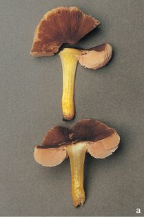 Goldleaf Shield Pluteus romellii (Britzelm.) Sacc. syn. P. lutescens (Fr.) Bres. syn. P. nanus var. lutescens (Fr.) P. Karst (illustrated 65% life size) Cap 1.5–5cm across, flattened convex or slightly umbonate; dark cinnamon-brown, margin paler to yellow and scarcely striate; cap surface often wrinkled towards the centre. Stem 15–70×2–6mm; bright lemon-yellow, becoming chrome-yellow at base. Flesh yellow; thin. Gills free; chrome-yellow at first, then yellowish-pink. Spores 6.5×5.5¼, subglobose. Spore print pink. Pleurocystidia thin-walled, broadly vesiculose, clavate, or cylindrical; hyaline. Cap cuticle of spherical cells with projecting fusiform elements. Habitat on the ground amongst wood chips or other rotting deciduous wood, especially beech; late spring to autumn. Frequent. Edible.