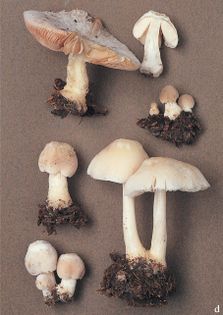 Pluteus semibulbosus (Lasch) Gillet (illustrated 70% life size) Cap 2–5cm across, bell-shaped to obtusely convex; white, tinged pale flesh-colour when moist; radiately wrinkled and as if powdered with mica flakes. Stem 20–30×3–7mm, bulbous; white. Flesh white. Gills free; white at first, becoming pink. Spores 6–7×5–5.5¼, broadly ovoid to subglobose. Spore print pink. Pleurocystidia thin-walled, bottle-shaped; hyaline. Cap cuticle of spherical cells with projecting fusiform elements. Habitat on rotting sawdust or wood of deciduous trees; autumn. Rare. Unknown edibility.