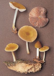 Yellow Shield Pluteus chrysophaeus (Schaeff.) Quél. syn. P. luteovirens Rea (illustrated 55% life size) Cap 2–4cm across, bell-shaped then flattened or umbonate; mustard-yellow to olivaceous-ochre. Stem 20–60×2–5mm; white then cream. Flesh yellowish in cap and stem base, elsewhere white; thin; taste and smell not distinctive. Gills free; white then pink, without yellow tints. Spores 5–6×5¼, subglobose. Spore print pink. Pleurocystidia thin-walled, bottle-shaped; hyaline. Cap cuticle of spherical cells with projecting fusiform elements and yellowish contents. Habitat on dead or dying elm; autumn. Frequent. Unknown edibility.