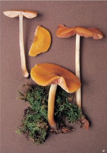 Lion Shield Pluteus leoninus (Schaeff.) P. Kumm. (illustrated 75% life size) Cap 4–6cm across, convex to flattened and slightly umbonate; deep yellow to bright golden, striate at the margin; minutely velvety. Stem 50–75×3–10mm; whitish, becoming flushed yellow from the base up. Flesh whitish, turning brownish in stem base; thin. Gills free; pale pink, often edged with yellow. Spores 6.5–7.5×5–6¼, subglobose. Spore print pink. Pleurocystidia fusiform. Cap cuticle filamentous. Habitat on wood of deciduous trees; autumn. Uncommon, rare on Red Data List. Unknown edibility.