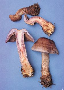 Cortinarius (Cortinarius) cyanites Fr. (illustrated 50% life size) Cap 5–12cm across, convex; mix of violaceous-purple, grey, and reddish-brown; slimy at first then dry, covered in brownish fibrils or scales. Stem 90–150×20–35mm, swollen to clavate; pallid purplish, sometimes red-spotted; fibrillose. Flesh purple, especially near surface, reddening after a few minutes when cut or bruised; taste slight or a touch bitter, smell distinctive. Gills adnate; violet for a long time. Spores 8–11.5×5–6.5¼, lemon-shaped, warty. Spore print rusty brown. Habitat in mixed woods; autumn. Very rare, vulnerable on Red Data List. Not edible. Note cut in half and rub the knife over cut surface to bruise it: in two or three minutes it will turn blood-red in patches. This should possibly be placed in the subgenus Phlegmacium.