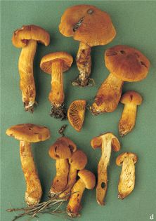 Deadly Webcap Cortinarius (Cortinarius) rubellus Cooke syn. C. speciosissimus Kühner & Romagn. (illustrated 45% life size) Cap 2.5–8cm across, convex to conico-convex then expanded and umbonate; tawny to tawny-date, margin paler; covered in fine, adpressed, fibrous scales, disc soon smooth. Stem 50–110×5–15mm, 20mm wide at slightly thickened or bulbous base; concolorous with cap or paler, lower part covered in yellow patches of velar remnants; silky fibrous. Flesh pale yellowish, tinged tawny below cap cuticle and towards stem base; taste not distinctive, smell slight, faintly of radish. Gills adnate; pale ochre at first, becoming tawny to deep rust. Spores 9–12×6.5–8.5¼, broadly elliptical to subglobose, rough. Spore print rust. Habitat in damp coniferous woods, often in moss; autumn. Rare. Deadly poisonous. Note in 1979 three people camping in the north of Scotland consumed C. rubellus, mistaking it for the edible Chanterelle. Nearly two weeks later they were admitted to hospital with severe renal failure caused by the orellanin complex of toxins present in C. rubellus. As is common in cases of orellanin poisoning, one of the three recovered while the others suffered irreparable damage to their kidneys and had to be kept on dialysis until kidney donors were found. In recent years C. speciosissimus has been responsible for many deaths in Central Europe.