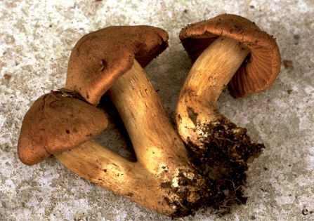 Fool’s Webcap Cortinarius (Cortinarius) orellanus Fr. (illustrated 50% life size) Cap 3–7cm across, bulbous when young, then clavate; pallid purplish; fibrillose. Stem cylindrical; warmly yellow, darkening to red-bronze. Flesh purple, especially near the exterior, turning red after two or three minutes when cut or bruised; taste slight or a touch bitter, smell distinctive. Gills adnate, distant; ochre at first then tawny, finally tinged rust. Spores 9–12×5–7¼, elliptical. Spore print rust. Habitat in deciduous woods; autumn. Very rare. Deadly poisonous. Note photographed by Geoffrey Kibby.