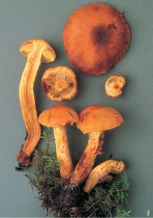 Sunset Webcap Cortinarius (Cortinarius) limonius (Fr.) Fr. (illustrated 40% life size) Cap 3–9cm across, convex then expanded and slightly depressed or umbonate; bright yellow-orange, darker at centre. Stem 50–120×8–20mm; yellow-orange above, becoming rusty-tawny towards the base, covered in scattered patches of yellow velar remains; cortina pale yellow. Flesh yellow to golden, often tawny below cap cuticle and stem base; smell faint, like raw potato. Gills adnate; yellow, soon golden, finally rusty-tawny. Spores 7–9×5.5–7¼, broadly ovate to subglobose, rough. Spore print rust. Habitat in coniferous woods; autumn. Occasional in northern areas, elsewhere rare, vulnerable on Red Data List. Poisonous. Note in my first book this fungus was named C. callisteus, but C. limonius is now considered the correct name.