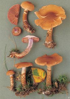 Scaly Webcap Cortinarius (Sericeocybe) pholideus (Fr.) Fr. (illustrated 55% life size) Cap 3–10cm across, convex, becoming expanded, sometimes centrally depressed or wavy at the margin; ochraceous-buff to light date-brown, darker towards the centre; covered in small, fibrillose, sepia scales. Stem 50–120×8–15mm; dirty ochraceous, flushed violaceous at apex at first, conspicuously dark brown and fibrillose-scaly below the distinct ring zone and darkening towards the base; cortina pale brown. Flesh pallid to ochraceous-buff, darker towards the stem base; smell faint, pleasant. Gills adnate; pale violaceous at first, soon becoming clay-buff to pale rust-brown. Spores 6.5–8.5×5–6¼, broadly elliptical, rough. Spore print rust. Habitat in deciduous woodlands, usually with birch; autumn. Uncommon. Suspect avoid.