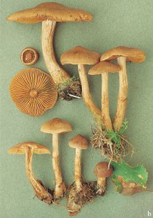 Cortinarius (Sericeocybe) raphanoides (Pers.) Fr. syn. C. betuletorum M.M. Moser (illustrated 50% life size) Cap 3–6cm across, conico-convex then bell-shaped or expanded and broadly umbonate; umber to grey-brown with an olivaceous tinge. Stem 40–80×8–12mm, base often swollen, up to 20mm wide; pale buff, with remnants of the pallid to olive-brown veil below; becoming hollow. Flesh light brownish; taste and smell sometimes slightly radishy. Gills adnate to free; pale ochre at first, later rust. Spores 7–7.5×5.5–6¼. Spore print rust. Habitat in deciduous woods, usually with birch; late summer to early autumn. Occasional. Suspect avoid. Note Professor M.M. Moser told me that he considered C. betuletorum to be only a synonym for C. raphanoides.