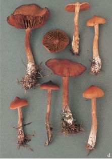 Cortinarius (Telamonia) brunneus var. glandicolor (Fr.) H. Lindstr. & Melot syn. C. glandicolor (Fr.) Fr. (illustrated 55% life size) Cap 2–5cm across, conical at first, then flat with an umbo; hygrophanous, dark brown when wet, blackening with age. Stem 40–120×4–10mm, long and narrow, base sometimes slightly swollen; silky white from veil towards the base when young, then brown with a distinct white ring zone. Flesh brownish; taste mild, smell slightly radish-like. Gills adnate; chestnut-brown. Spores 8–10×5.8–6.7¼, broadly ovate, finely roughened. Spore print rusty brown. Habitat in mixed woodland and with conifers; early autumn. Uncommon. Not edible.