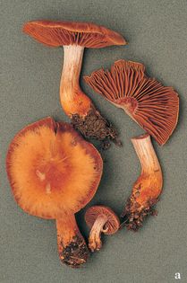 (Pers.) Fr. (illustrated 45% life size) Cap 4–8cm across, convex then expanded; deep red-brown to chestnut, drying ochre-buff. Stem 50–100×10–15mm; whitish near apex, becoming rust and covered in reddish fibres towards base. Flesh whitish, sometimes reddish at stem base; taste and smell not distinctive. Gills adnate to free; violaceous at first, soon rusty. Spores 8–10×5–6¼, elliptical, rough. Spore print rust. Habitat in deciduous woods, especially with beech; autumn. Rare. Suspect avoid.
