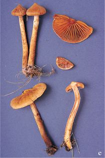 Earthy Webcap Cortinarius (Telamonia) hinnuleus (Sowerby) Fr. (illustrated 45% life size) Cap 2.5–6cm across, convex to bell-shaped, then expanded and umbonate; dark ochre-brown when moist, drying paler and more ochraceous, margin pallid when young, and covered in the whitish, cobwebby veil. Stem 30–100×5–12mm; paler than cap; covered below in white, silky velar remains, often forming a distinct white ring-like zone; cortina white. Flesh whitish, tinged with cap colour, often flushed violaceous in stem apex when young; taste mild with a slightly bitter aftertaste, smell slight, sometimes faintly of radish. Gills adnate, distant; tinged violaceous at first, ochraceous then tawny. Spore print rust. Spores 7–9×4–4.75¼, narrowly elliptical, minutely roughened. Habitat with poplar and willow; autumn. Occasional. Unknown edibility.