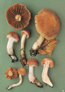 Cortinarius (Telamonia) rigens (Pers.) Fr. syn. C. duracinus Fr. syn. C. candelaris sensu auct. mult. (illustrated 45% life size) Cap 3–10cm across, convex then expanded to domed, usually with an inrolled margin; hygrophanous, cinnamon-brown when wet, pallid cream to reddish-ochre when dry; surface smooth. Stem 40–120×6–15mm, tapering downwards, usually to a rooting point; white, smooth. Flesh white; smell similar to iodine. Gills adnate, creamy coloured at first, then reddish-buff. Spores 9–11×5–6.5¼, ovoid, lightly roughened. Spore print rusty brown. Habitat in broad-leaved or mixed woods; autumn. Uncommon. Not edible.