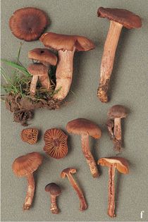 Cortinarius (Telamonia) umbrinolens P.D. Orton syn. C. rigidus sensu Lange (illustrated 45% life size) Cap 1.5–4cm across, conical, becoming expanded and umbonate; dark brown when moist, especially at the centre, drying yellow-brown, with a pale edge; surface silky to matt. Stem 30–70×2–6mm; brown with a darker base; covered at first with the white, cottony veil, which forms distinct but short-lived zones. Flesh umber, drying lighter; smell strong, of rotten cloth. Gills adnate; distinct deep brown with a lighter edge. Spores 7.5–9.5×4.5–6¼, broadly elliptical. Spore print rust. Habitat in damp locations on deciduous heathland, usually with birch; autumn. Uncommon. Suspect avoid.